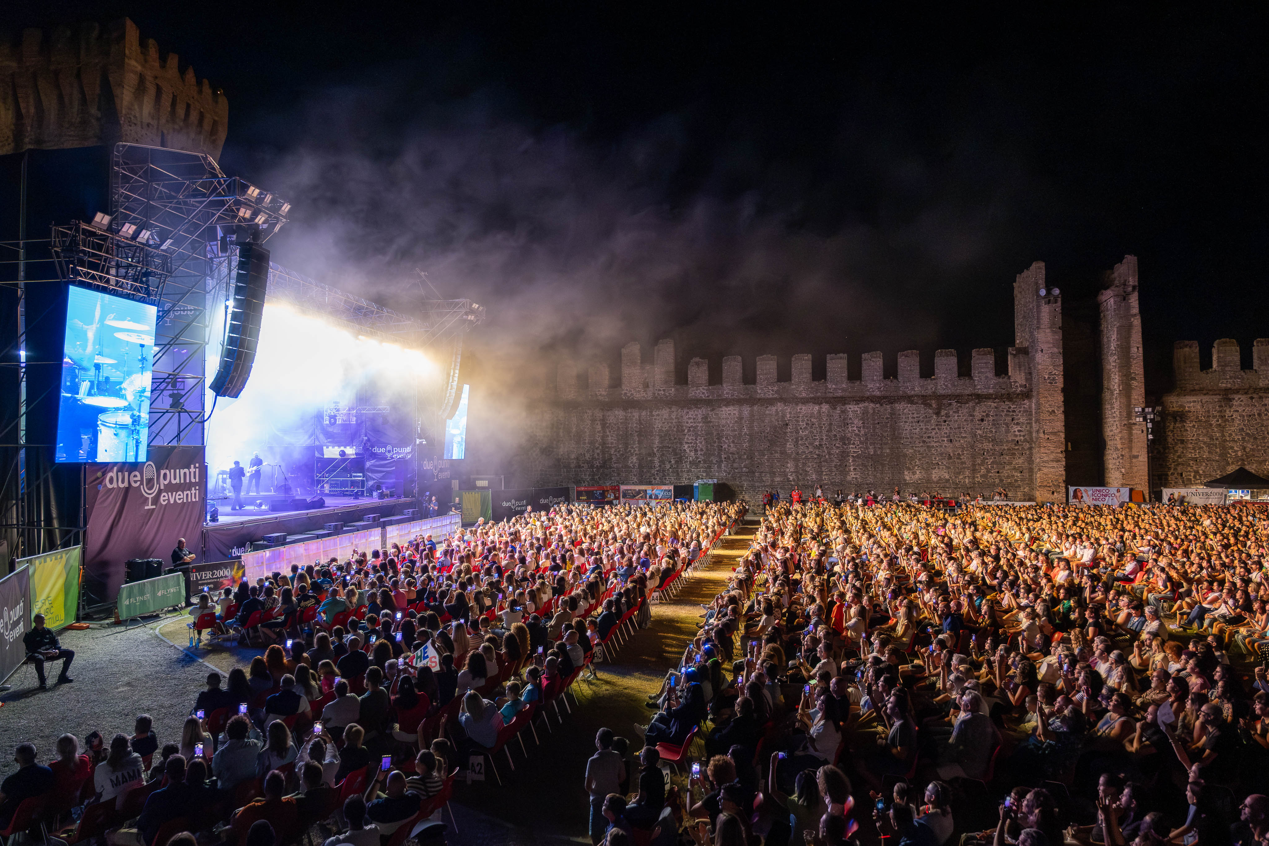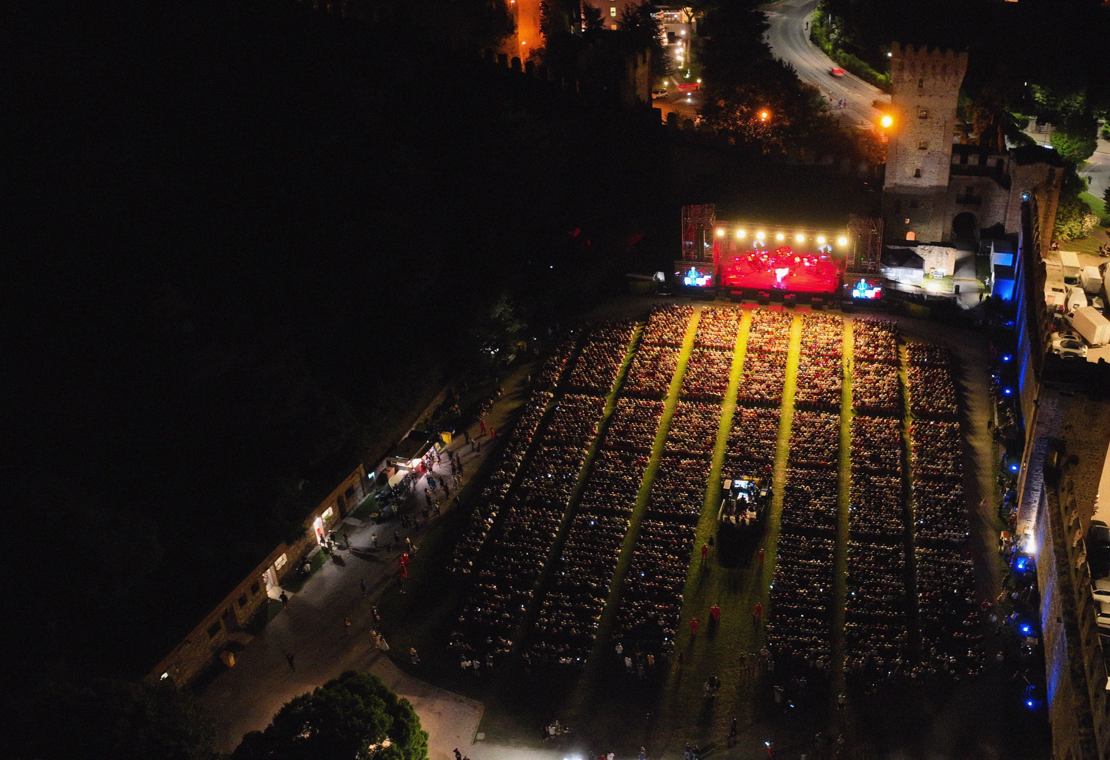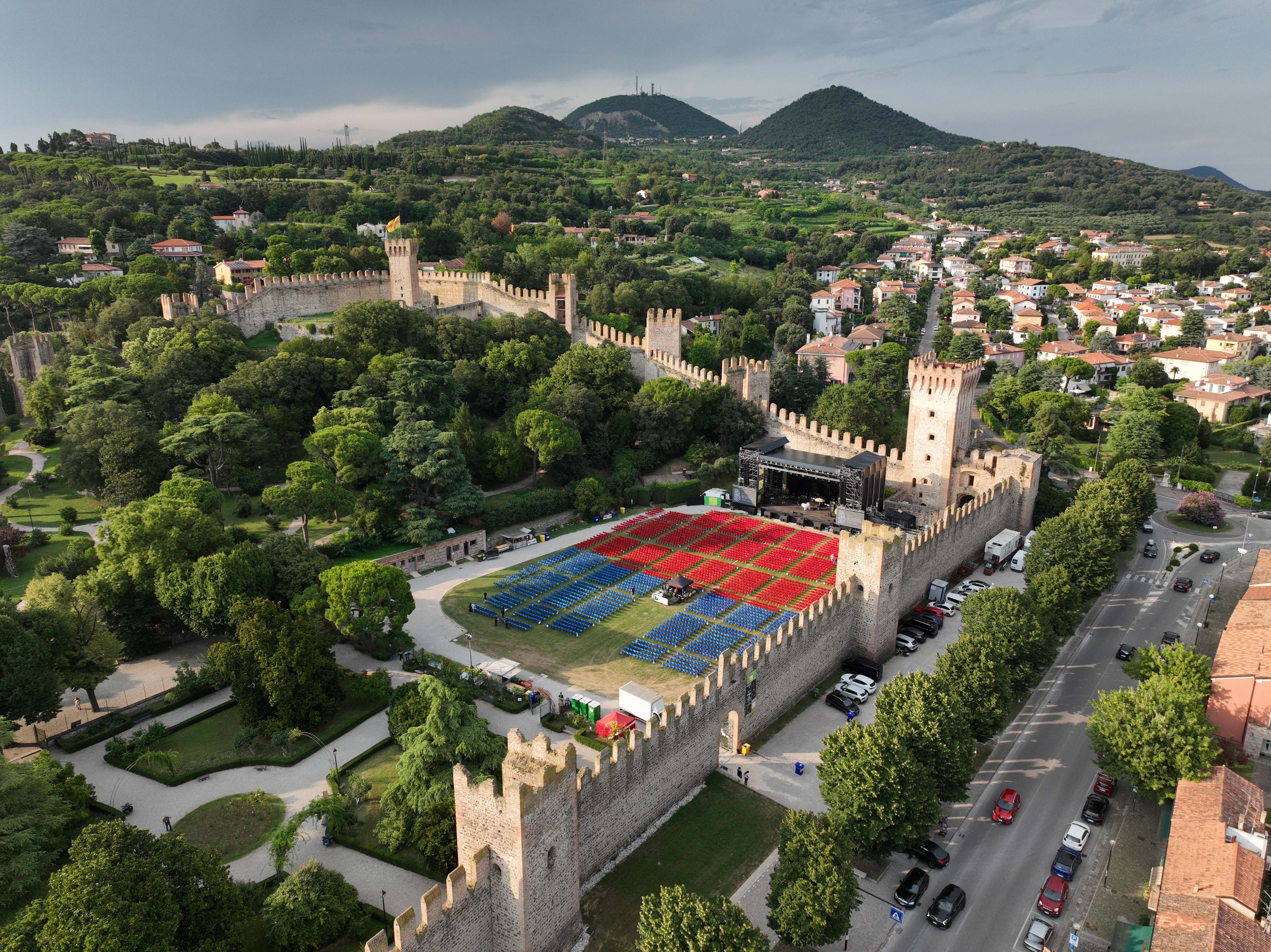 Un vero teatro a cielo aperto immerso nel verde, racchiuso in un contesto storico di straordinario valore. A rendere unica l’atmosfera è l’imponente Castello Carrarese, che domina la città con le sue torri maestre e con la poderosa cinta muraria, lunga circa un chilometro, che abbraccia l’estrema propaggine meridionale dei Colli Euganei. Simbolo dell’importanza strategica e culturale che Este rivestì in epoca medievale, questo straordinario complesso architettonico fa da scenografia naturale a serate di musica e spettacolo, offrendo al pubblico un’esperienza che va oltre il concerto: un incontro perfetto tra emozione, storia e bellezza.